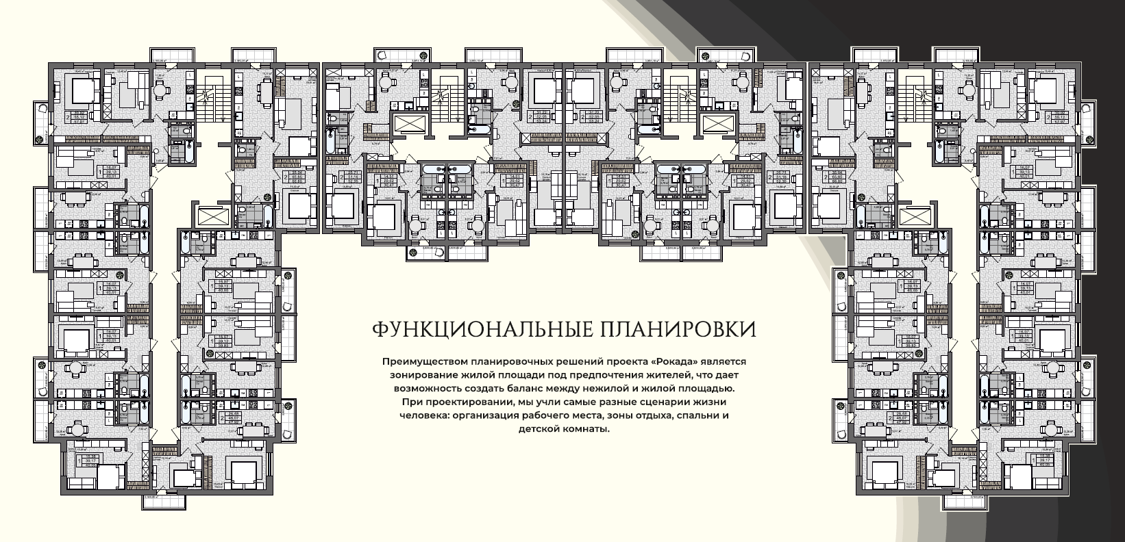РОКАДА — девятиэтажный жилой комплекс, на первом этаже которого размещены коммерческие помещения, начиная со второго - квартиры. Также в подвальном помещении расположены индивидуальные кладовые.